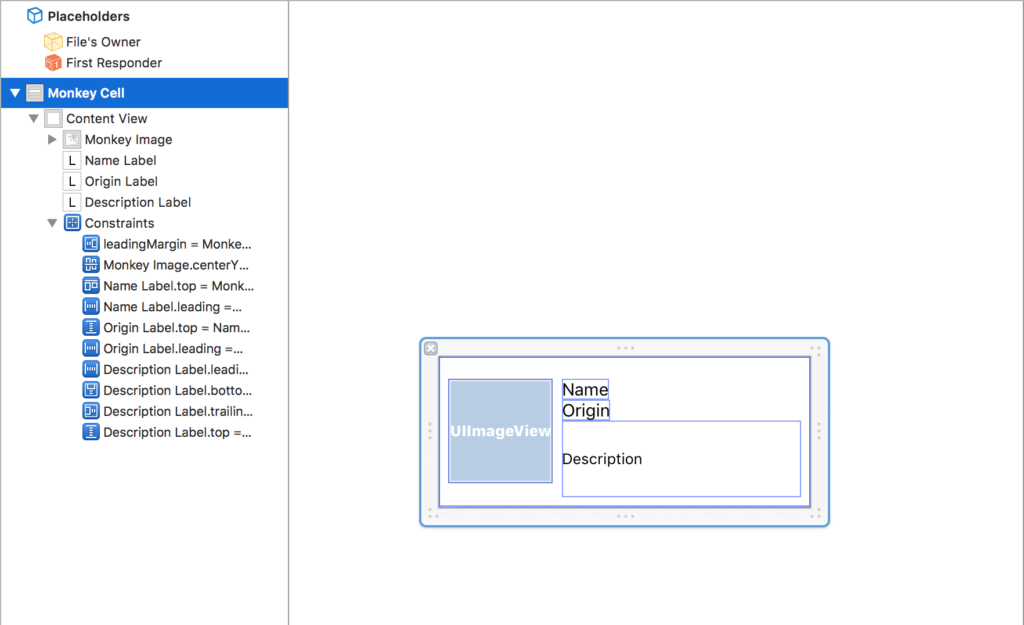 Open the “MonkeyCell.xib” and design the cell however you want. You are free to do as you please as long as you expose the properties that you use so we can bind to them. My cell looks like this: